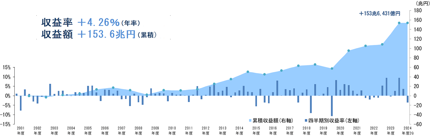投資先の米国や欧州の株価は第2四半期の期間中に上昇していたが、円相場は対米ドルで6月末の160円86銭から9月末には143円4銭になるなど欧米通貨に対して高くなった。